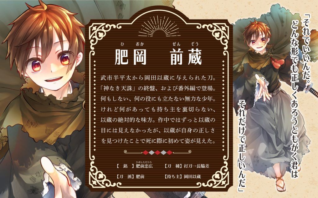 基本的には何もしない、何の役にも立たない無力な少年。けれど絶対に寄り添うことを諦めない、何があっても持ち主を裏切らない以蔵の絶対的な味方。以蔵が自殺未遂を図った際には刀身が折れることも厭わず助けようとするなど、自己犠牲的ではあるが自分を捨ててはいない。霊力は強くないが、人を救うことに特化した付喪神。
